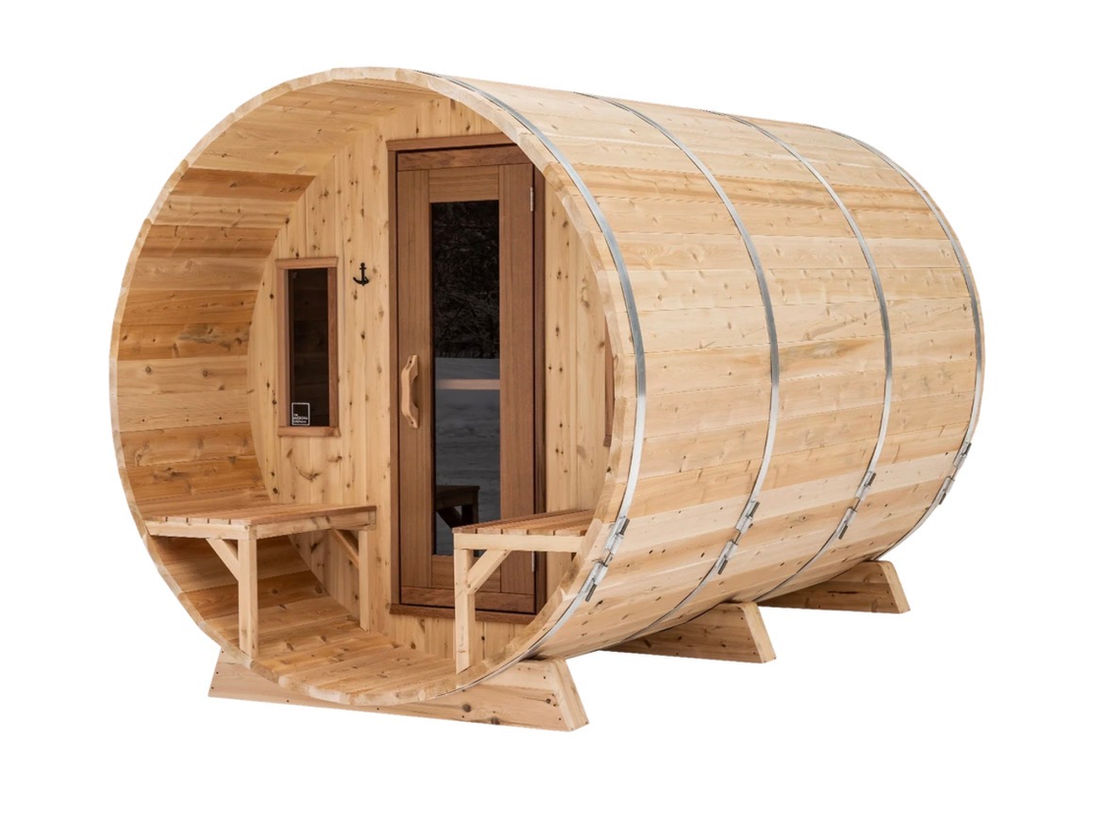 Experience authentic at-home sauna wellness with our handcrafted barrel sauna proudly constructed out of white cedar in Ontario. Comfortably seats 4 people and is available with an electric or wood-burning stove. A certified electrician is required for electric heater installation.