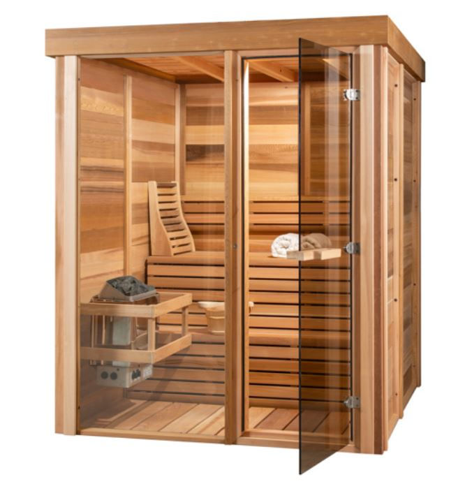 This sleek indoor sauna features premium western red cedar construction with a contemporary design that elevates any space. The expansive front window and full glass door flood the interior with natural light, while optional semi-private panels add refined style. A perfect addition to any indoor gym or wellness space.