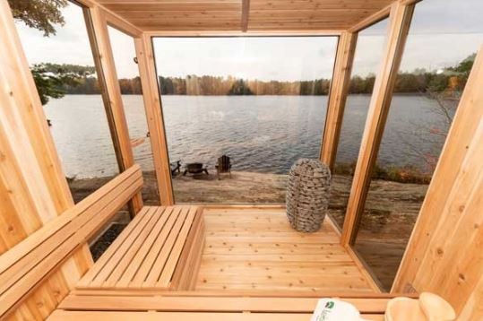 The 180-degree windows create the sensation of relaxing on your deck or dock while enjoying premium sauna benefits. Sleek black metal siding and western red cedar construction deliver modern elegance, with full insulation throughout for optimal performance.