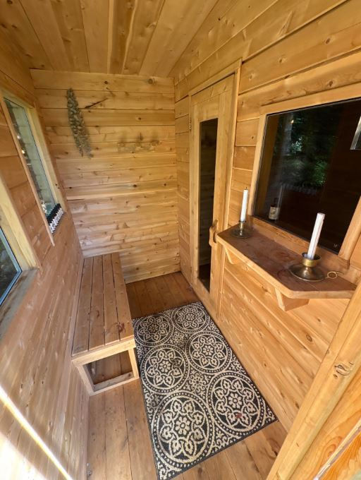 Crafted from premium Canadian aromatic white cedar, this beautiful lean-to sauna brings rustic elegance to any backyard. Comfortably seats 6 people and and is available with either an electric or wood burning stove (please note that a certified electrician is required for electric heater installation).